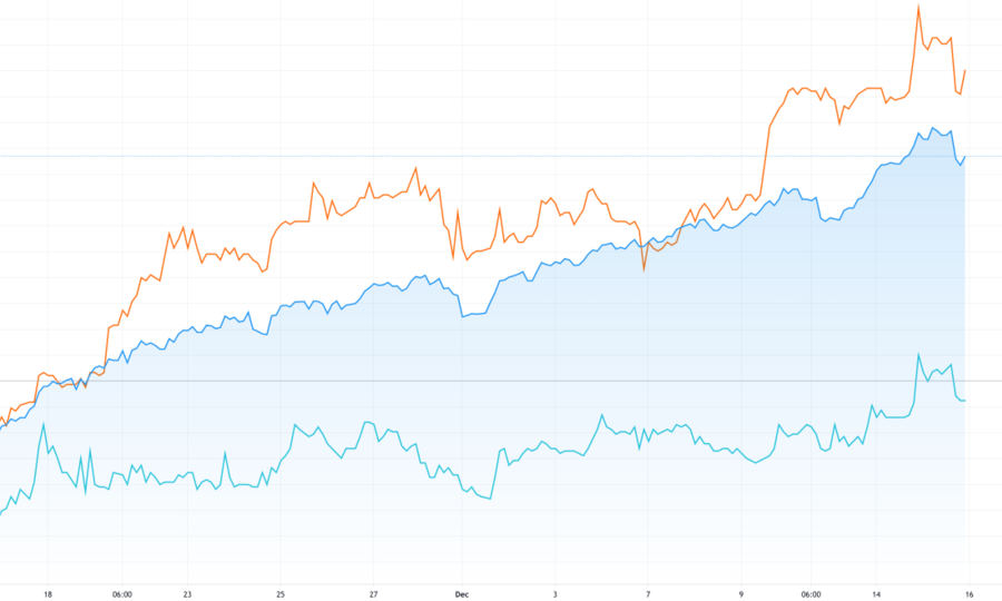 Cổ phiếu VCB (đường màu cam) đã tăng hơn 12% trong năm qua. Nó đã vượt chỉ số VN Index (tăng 8,7%) và VIC (giảm 0,7%) trong tháng trước. Ảnh: Chế độ xem giao dịch.