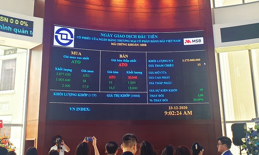 Ngân hàng TMCP Hàng Hải Việt Nam (MSB) chính thức giao dịch 11,75 nghìn tỷ cổ phiếu trên Sở Giao dịch Chứng khoán Thành phố Hồ Chí Minh vào sáng nay, với giá chuẩn là 15.000 đồng. Đây là ngân hàng mới niêm yết đầu tiên trong năm nay.