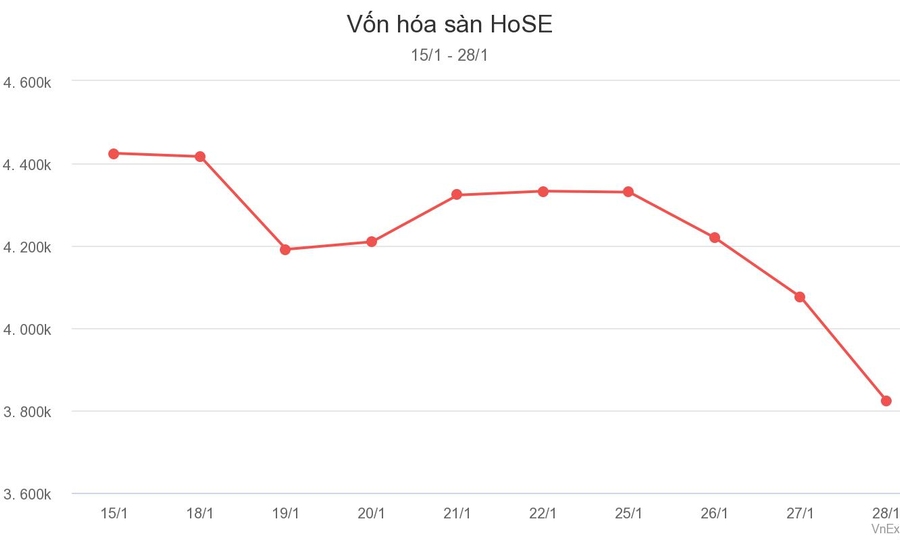 Tính riêng sàn HoSE, so với mức cao nhất thị trường chưa đầy một tháng vào ngày 15/1, chưa đầy nửa tháng, chỉ số VN index đã giảm 14%, giá trị thị trường vượt 6.000 nghìn tỷ đồng. -Minh Sơn