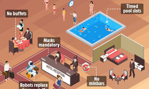 Vì nhân viên cần thời gian làm sạch lâu hơn do thời gian khử trùng, thời gian lên máy bay có thể bị trì hoãn. Thẻ từ và chìa khóa có thể bị mất vì nhiều khách sạn sử dụng phòng không có khóa. Nó sẽ là ứng dụng và công nghệ sử dụng đóng để mở. Đối với những vị trí không thể sử dụng ứng dụng, chìa khóa sẽ được khử trùng mỗi khi khách rời khỏi phòng. Một số khách sạn thậm chí đã bắt đầu sử dụng nhiều robot dọn dẹp để hạn chế khả năng tiếp xúc với nhiều người của khách. Loại robot này rất phổ biến ở Nhật Bản.